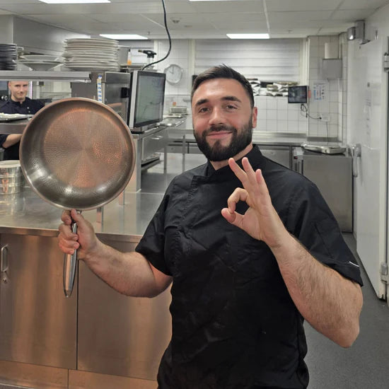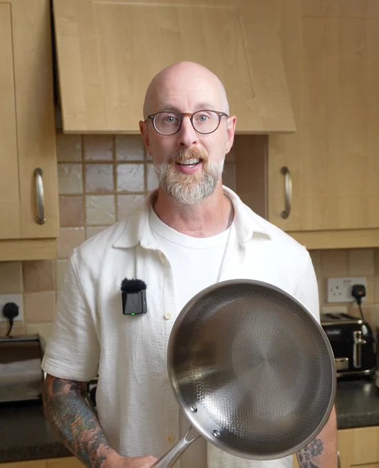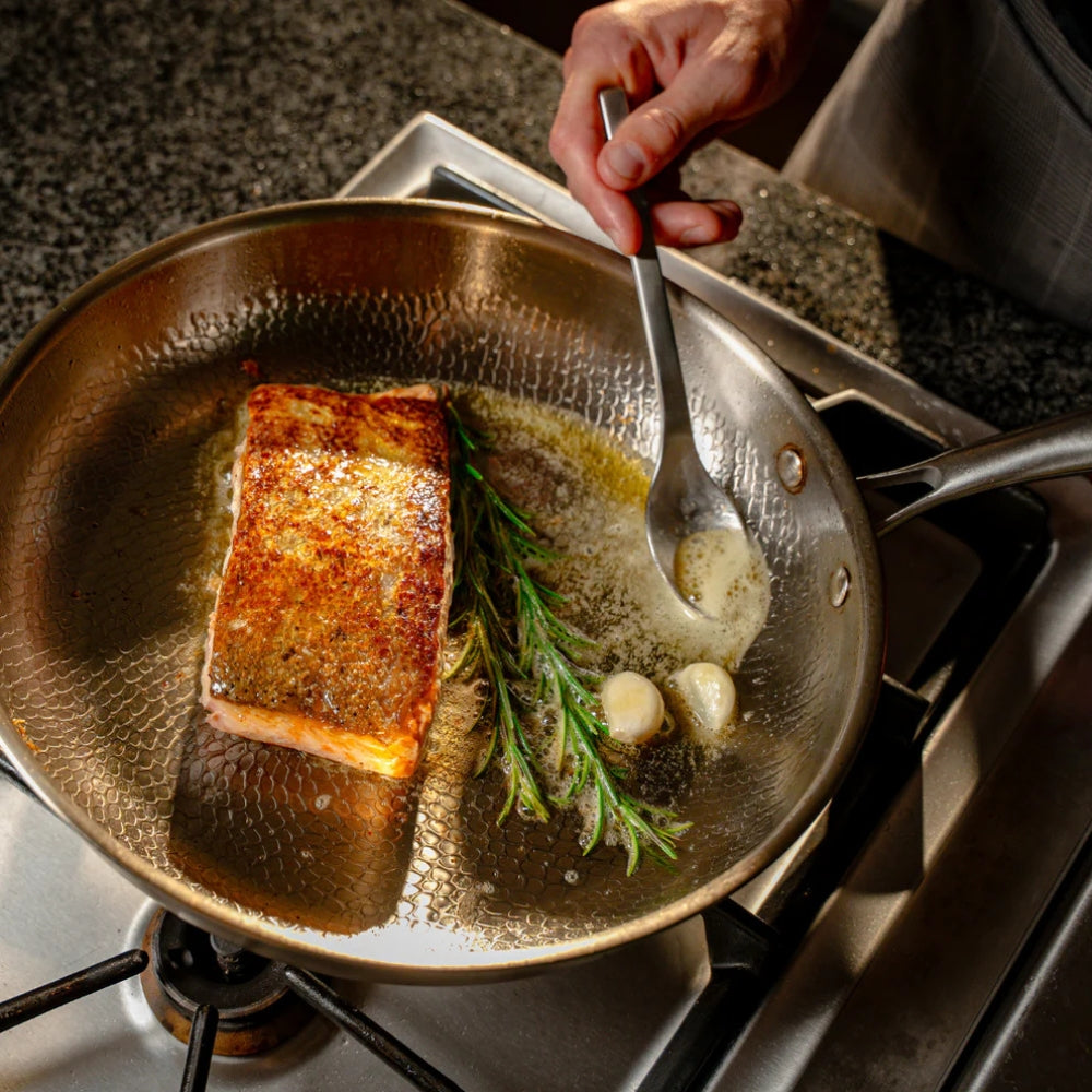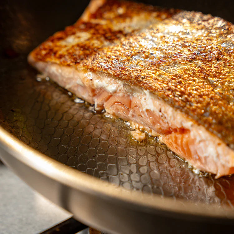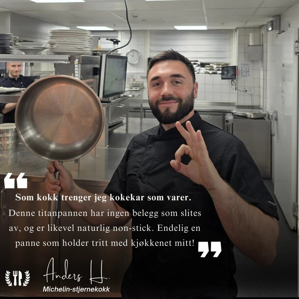 Våre panner er laget av 100 % rent titan av Grade 1-kvalitet, ferdigstilt med en håndhamret mikrostruktur. Dette skaper naturlige fordypninger som reduserer fastbrenning, forbedrer luftstrømmen og gjør pannen hydrofob over tid. Resultatet er en naturlig non-stick-overflate – helt uten teflon, belegg eller kjemikalier.