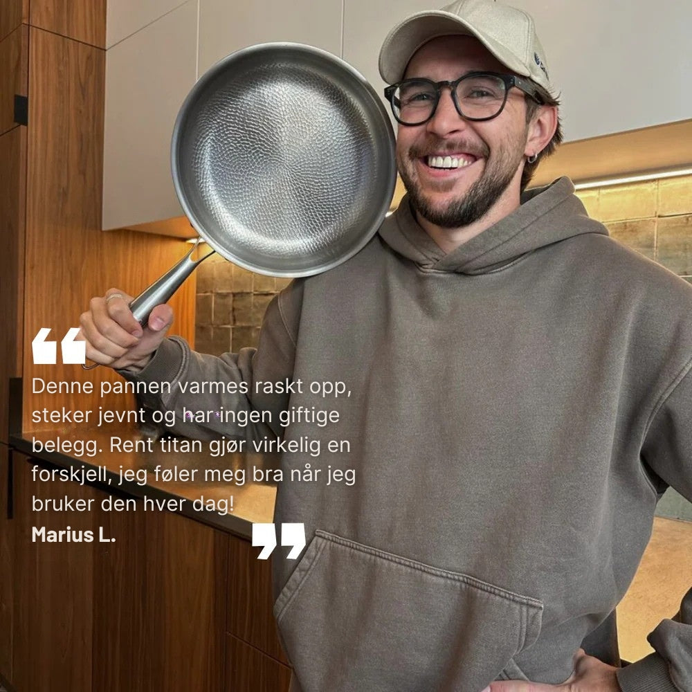 Nei. Null giftstoffer. Våre panner er fri for alle belegg, mikroplast, evighetskjemikalier eller skjulte behandlinger. Bare 100 % rent titan, sertifisert matsikkert og brukt i medisinske applikasjoner.