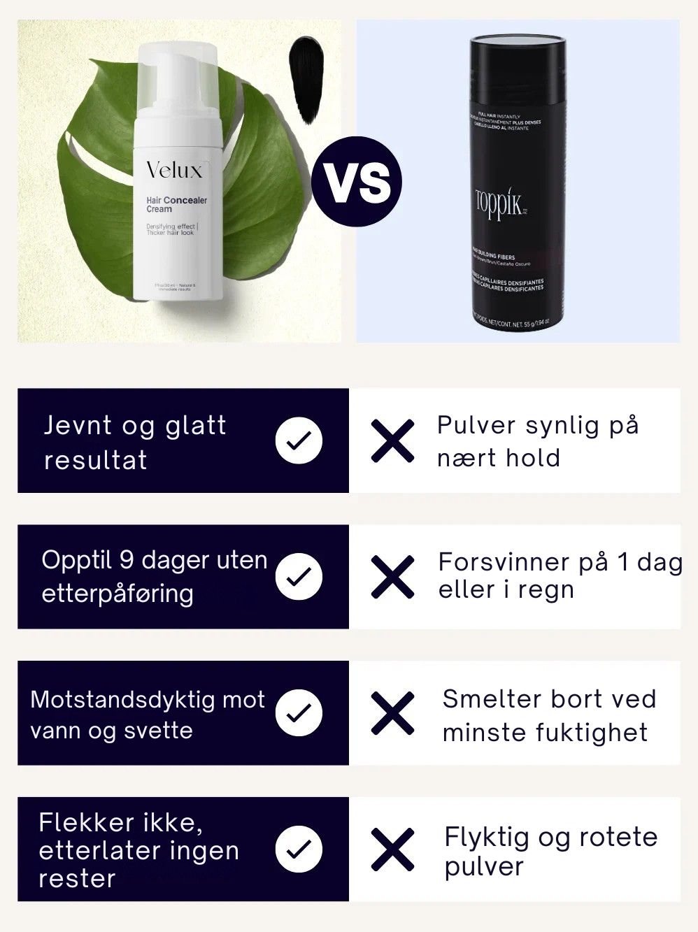 👉 Møt Velux: en diskret hårconcealer-krem som fyller ut tynne områder med en naturlig, matt finish som varer i opptil 9 dager.